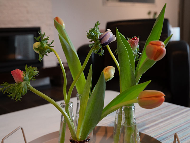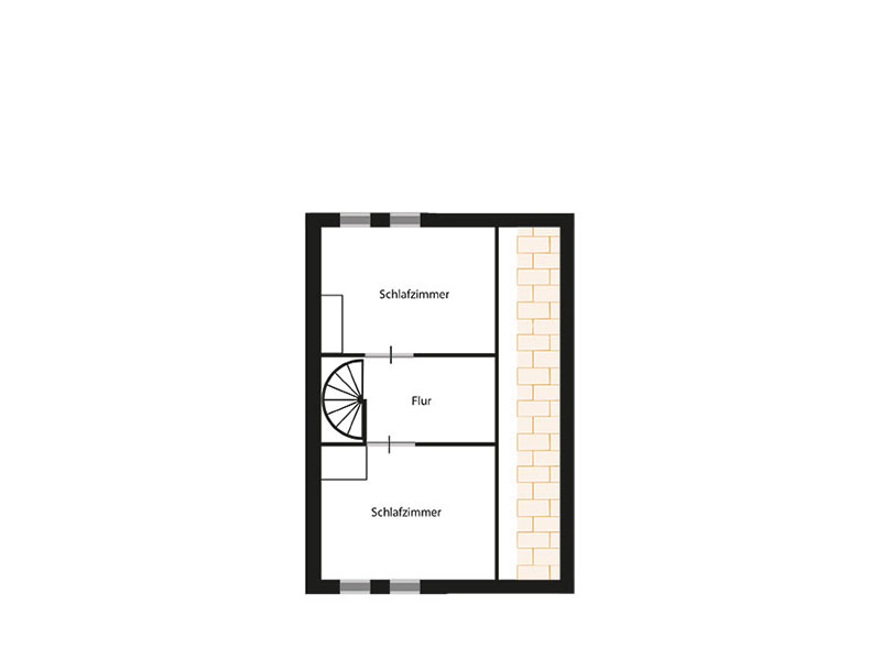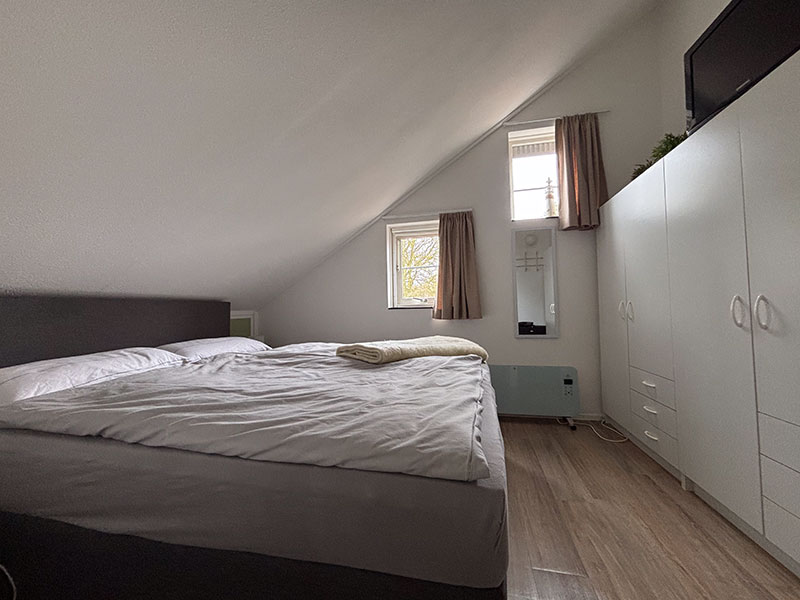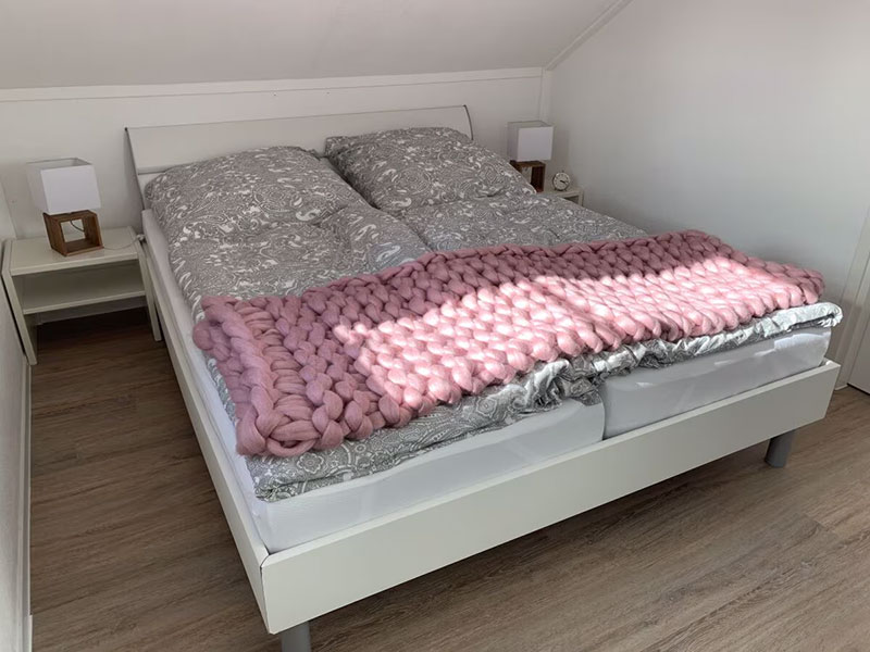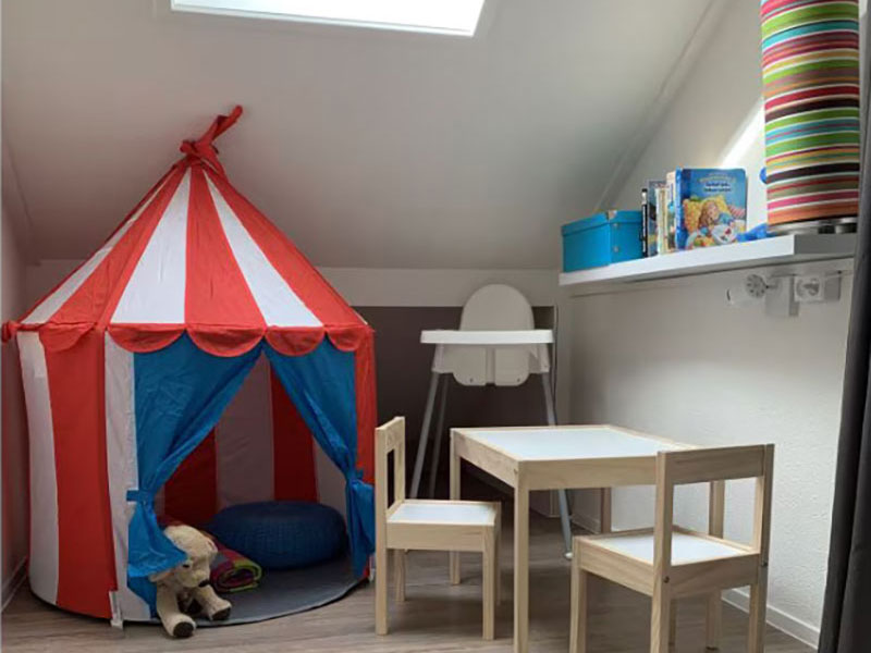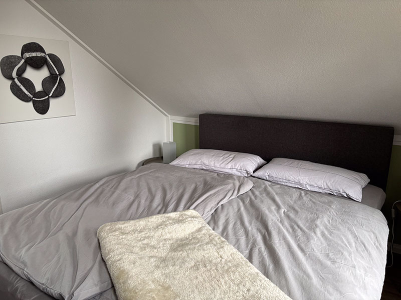 Über die Wendeltreppe im Wohnbereich gelangt Ihr ins Obergeschoss zu den beiden Schlafzimmern mit Doppelbetten. Zwischen den Zimmern haben wir eine offene Spielecke für Kinder eingerichtet.